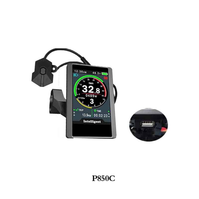 - 1x Barvni LCD zaslon – P850C – ki omogoča 9 stopenjsko nastavitev moči motorja, števec hitrosti, povprečne hitrosti, merilec prevožene razdalje, možnost polnjenja naprav (telefon, ura…) preko USB